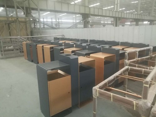 从本文的两幅图片可以清楚的看到这款不锈钢垃圾桶的颜色为黄色和黑色,两种颜色相互交差,形成强烈的色差,让人可以更方便的对投放的垃圾进行分类,同时也给垃圾桶增加了一种特殊的美感。另外双色不锈钢垃圾桶在制作工艺上也具有特点。第一:不易损坏。单个垃圾桶重量在100公斤,采用2mm的优质双层不锈钢板制成,内桶并安装有加强筋,使整个垃圾桶具有非常强的搞破坏性,即使受强力撞击及从高空落下,也不会有任何损伤。第二:垃圾桶表面做精磨抛光处理,并喷涂高性能纳米汽车漆,不易掉色,外观更细腻。第三:加工精度极高,垃圾桶的加工误差小于1mm,从外观上看不出任何瑕疵,达到不锈钢工艺品的制作标准。第四、烟灰缸采用激光切割技术下料,并采用无缝焊接技术,最后精抛光处理。